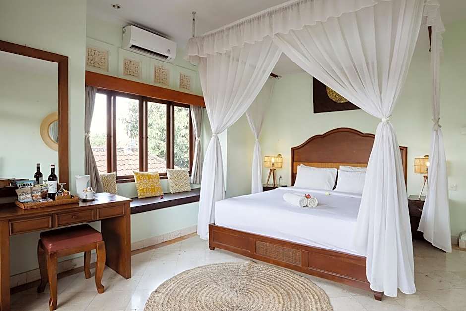 Balinese-style rooms with air conditioning, mosquito nets and a flat-screen TV. Certain rooms come with a balcony, while others have a terrace overlooking the tropical garden.