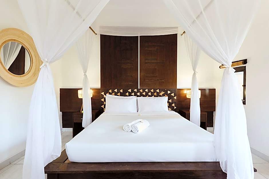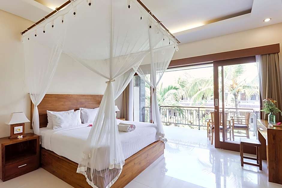 A spacious, air-conditioned room with mosquito nets and a flat-screen cable TV. It also features a private balcony offering views of tropical gardens or pool and a bathroom with a bathtub.